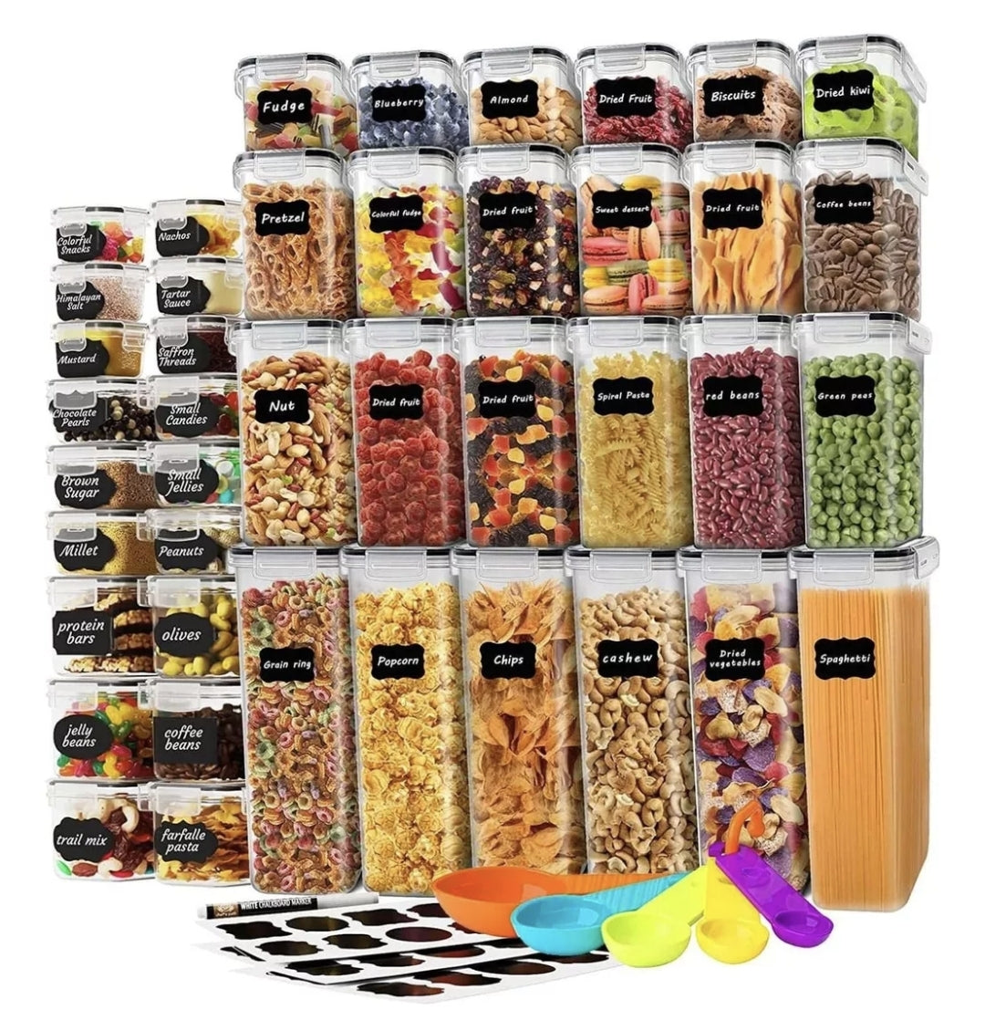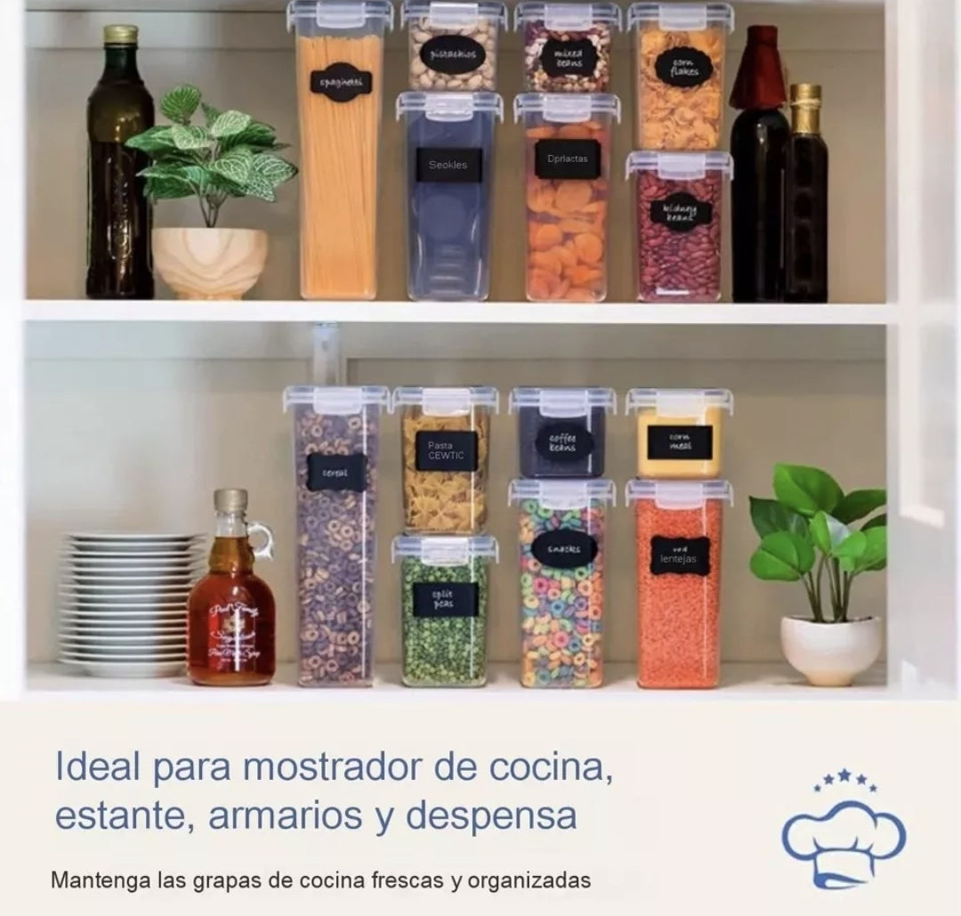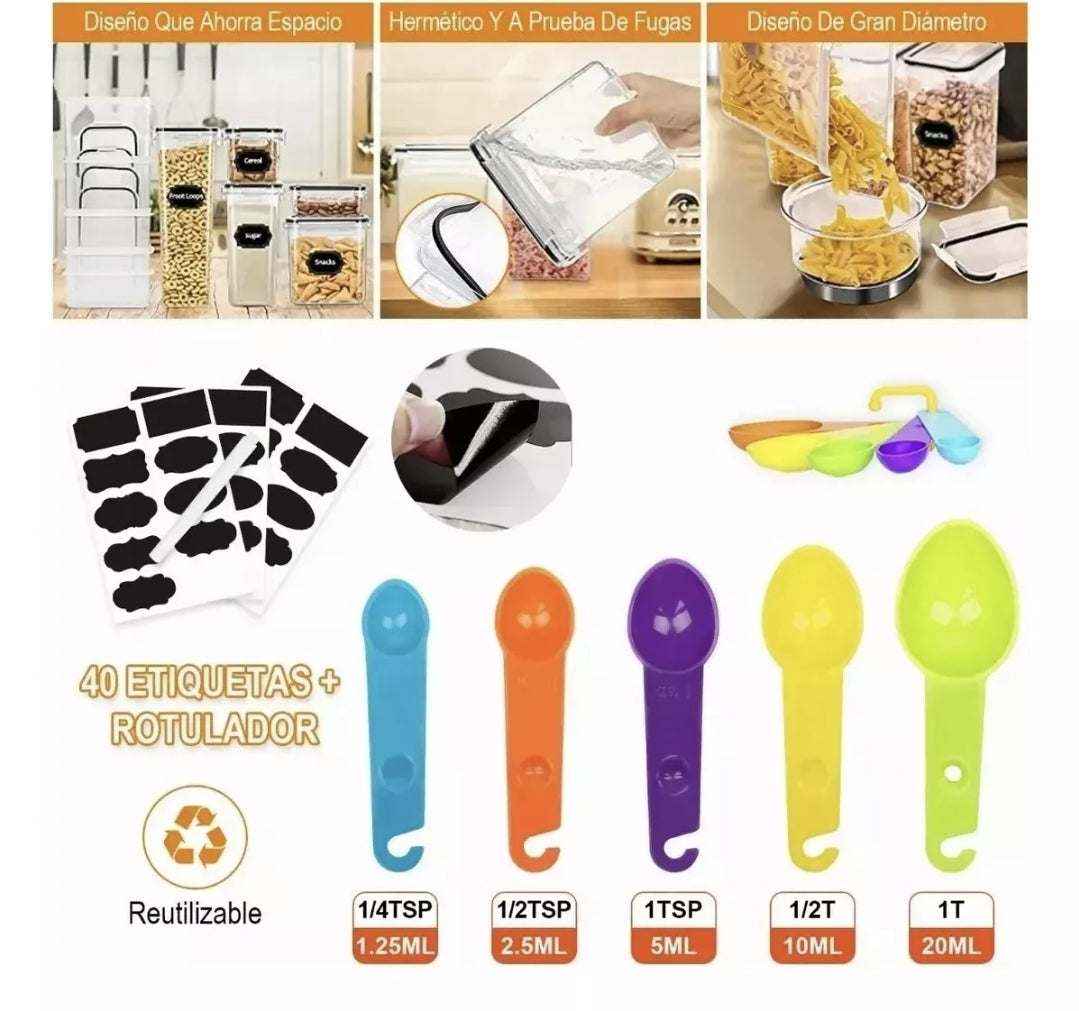 El set de recipientes herméticos incluye 42 recipientes,7 tamaños diferentes, cada tamaño cuenta con 6 piezas, libre de BPA, con un juego de cucharas medidoras para la organización exacta de tus alimentos, incluye etiquetas y un rotulador para que personalices tus recipientes.