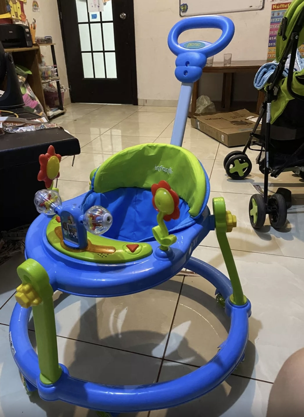 Incluye una barra de empuje para que los adultos puedan asegurarse de que su hijo está seguro y cómodo durante sus primeros pasos. El tapete para pies proporciona una superficie antideslizante y confortable, y las dos posiciones ajustables de altura permiten que la andadera se ajuste al crecimiento del bebé.