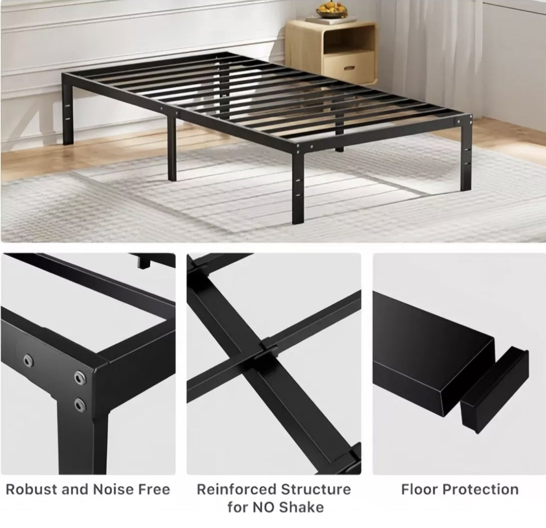 El marco de la cama individual está hecho de materiales metálicos de alta calidad, y las piernas reforzadas evitan distorsiones estructurales. El esquema de color negro de la robusta cama de plataforma es más de moda en el estilo de la habitación y tiene una fuerte capacidad de carga para soportar un mayor peso.