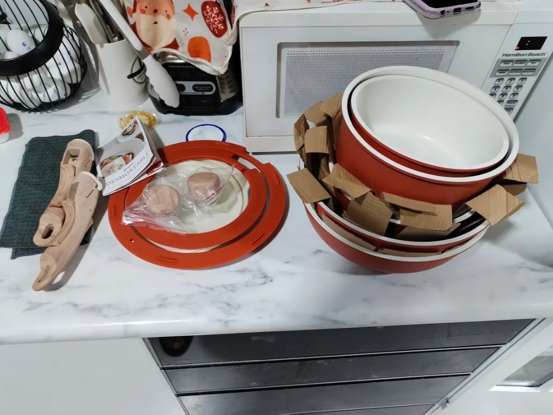 2.Mango Desmontable Seguro: Este juego de utensilios cuenta con un innovador diseño de mango desmontable equipado con un mecanismo de bloqueo seguro. Garantiza un agarre estable y confiable durante la cocción, permitiéndole operar con total tranquilidad en cada uso. Su diseño desmontable permite adaptar las ollas fácilmente a todo tipo de cocinas, y transitar sin problemas entre horno, parrilla, refrigerador y mesa.
