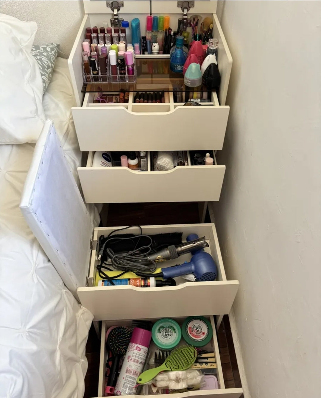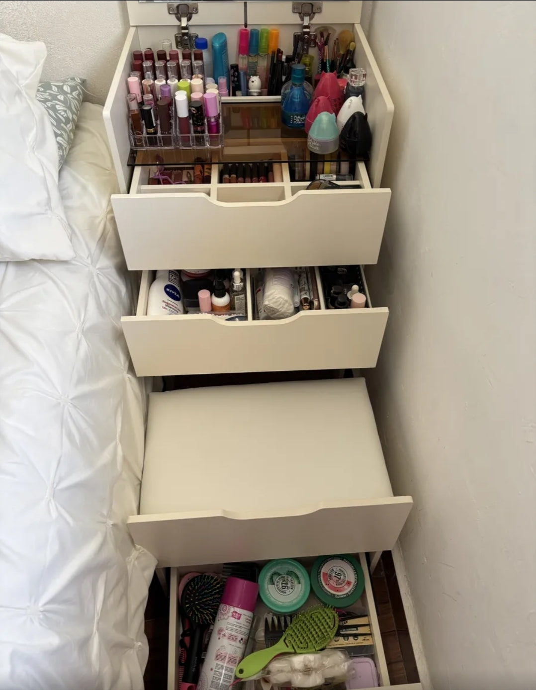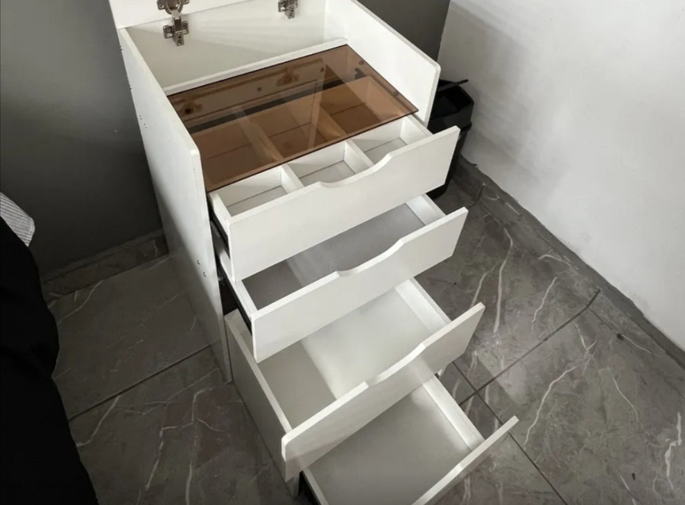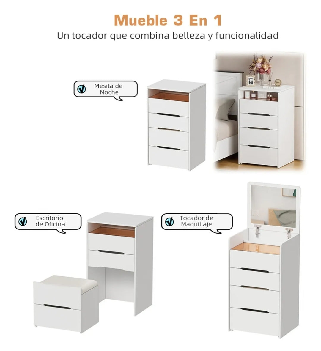 Cómoda compacta plegable con taburete oculto que se extrae cuando está en uso y se transforma en una elegante mesita de noche cuando no está en uso. Es un mueble polivalente que ahorra espacio y dinero en el dormitorio.