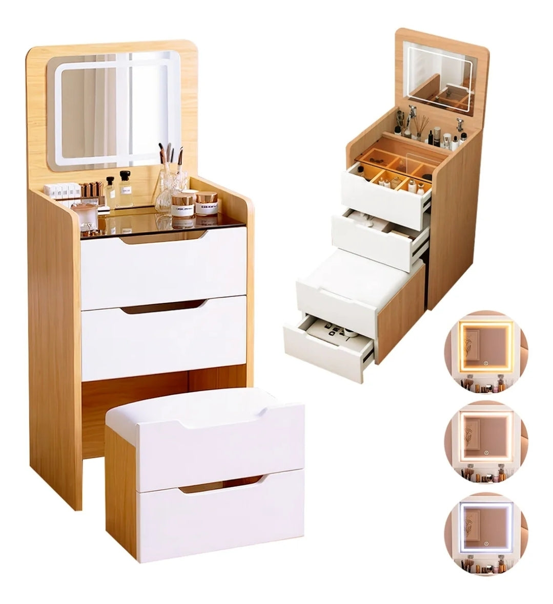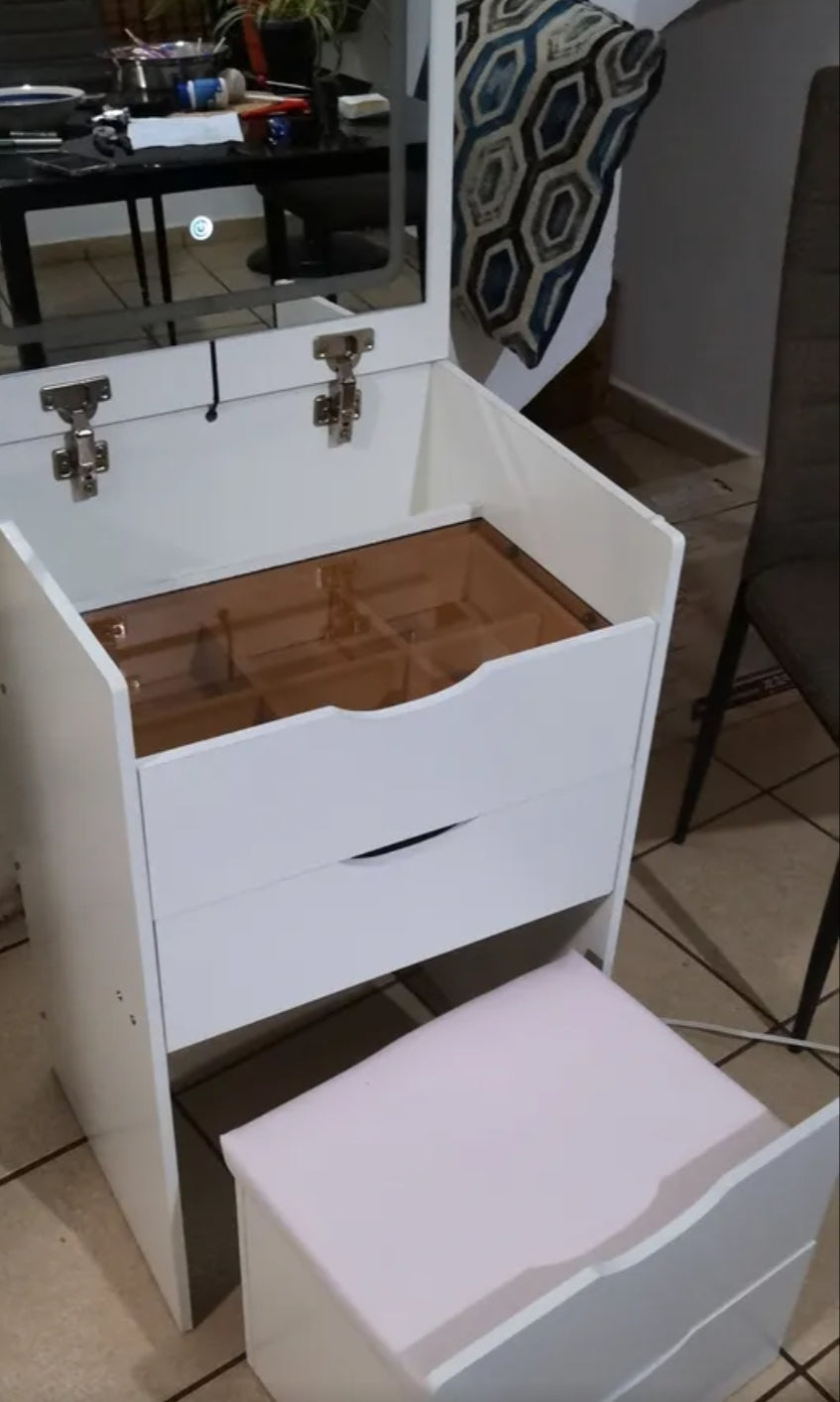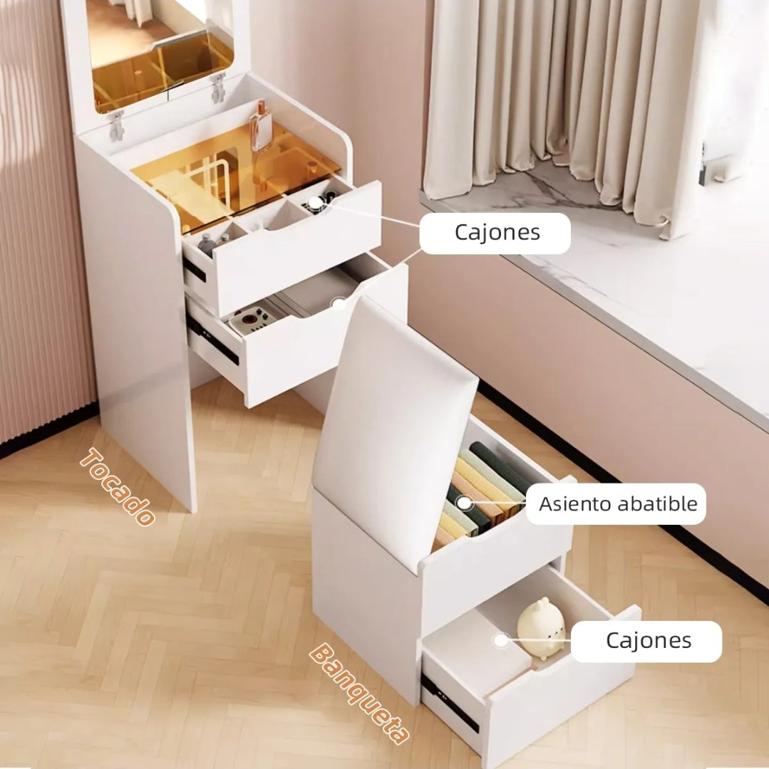 Buró tocador con espejo LED y banco oculto 4 cajones