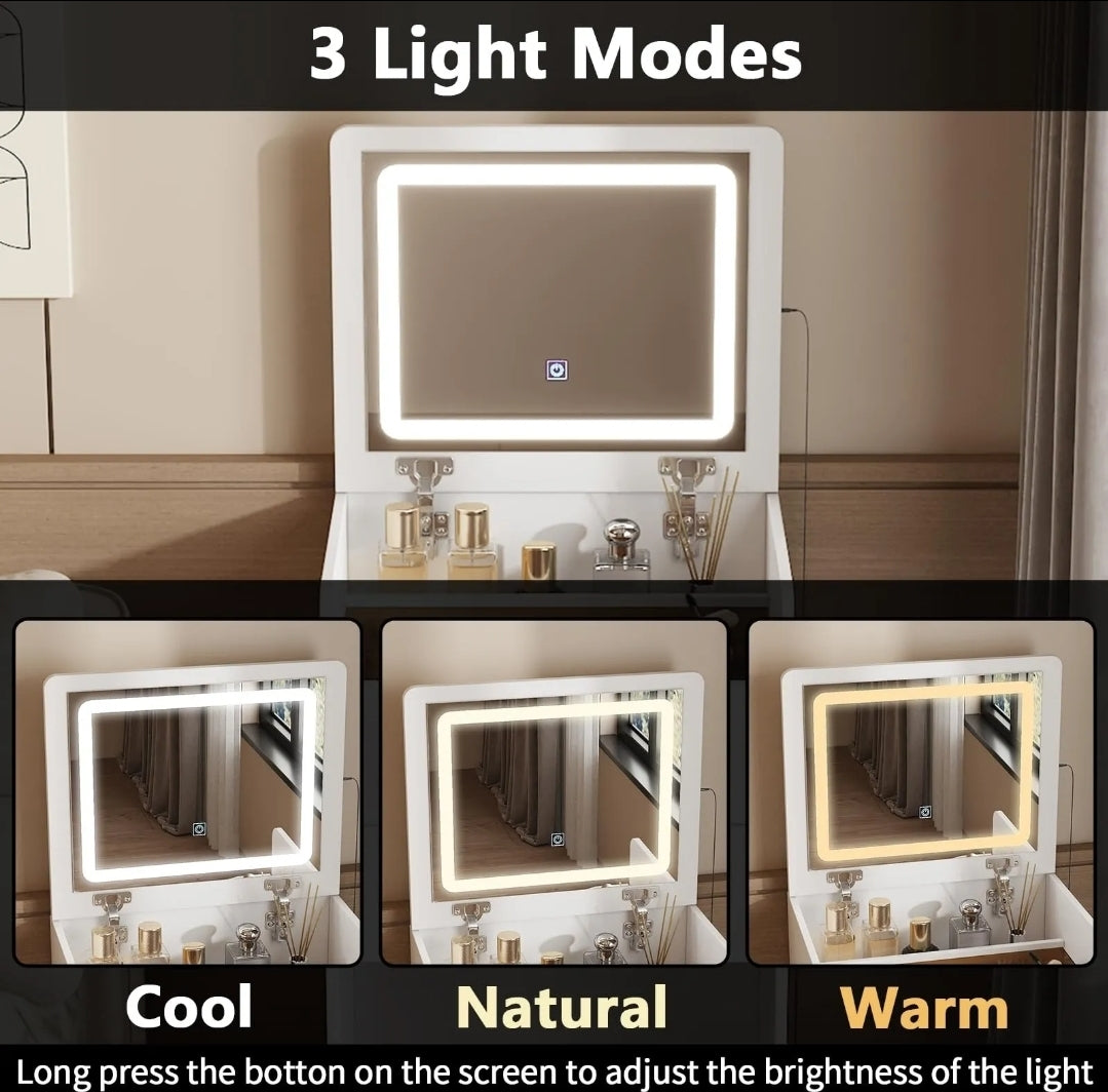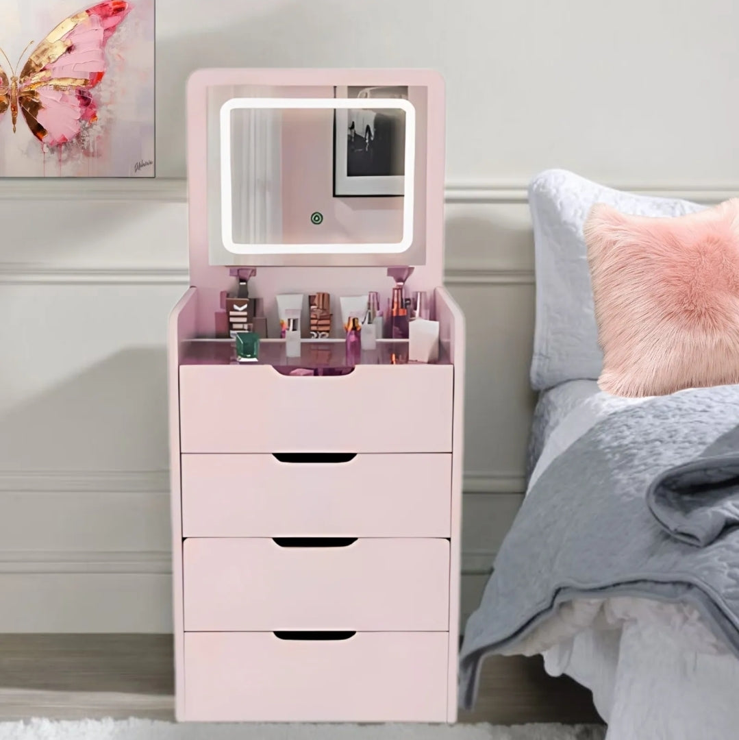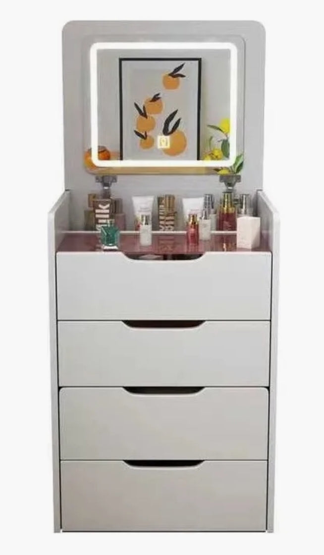 Buró tocador con espejo LED y banco oculto 4 cajones