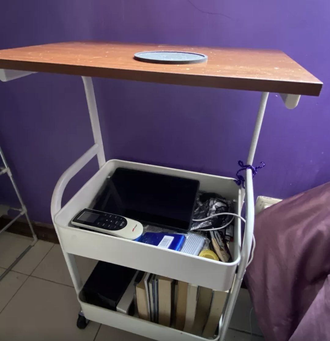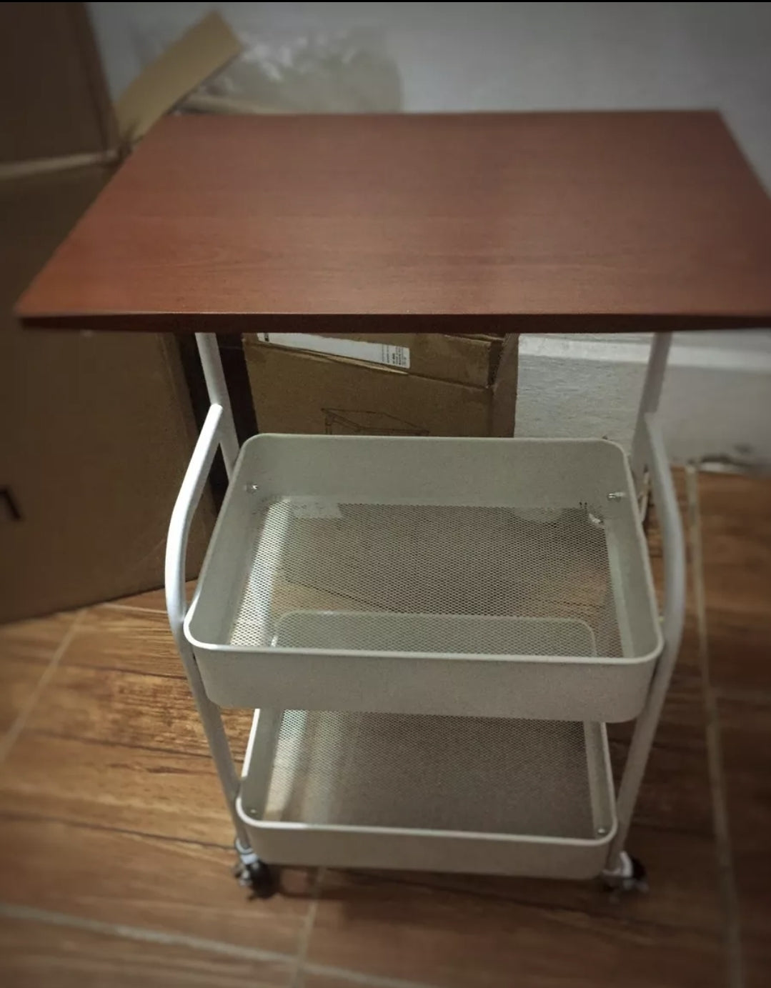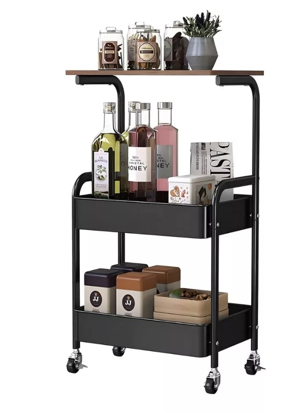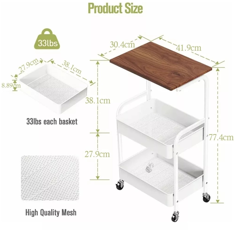 Almacenamiento rodante de 3 niveles con una parte superior plana de madera que sirvió para todos sus propósitos como escritorio para computadora portátil, tablero de cubierta