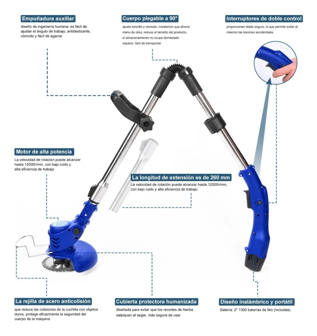 Recortadora de césped inalámbrica de alta potencia: nuestra cortadora de malezas con un potente motor de 7400 RPM y cuchillas súper afiladas, inalámbrica y sin preocuparse por el cable desordenado, cuida más fácilmente el césped en el jardín. ¡Traiga esta herramienta portátil y disfrute de un tiempo de trabajo doméstico rápido!