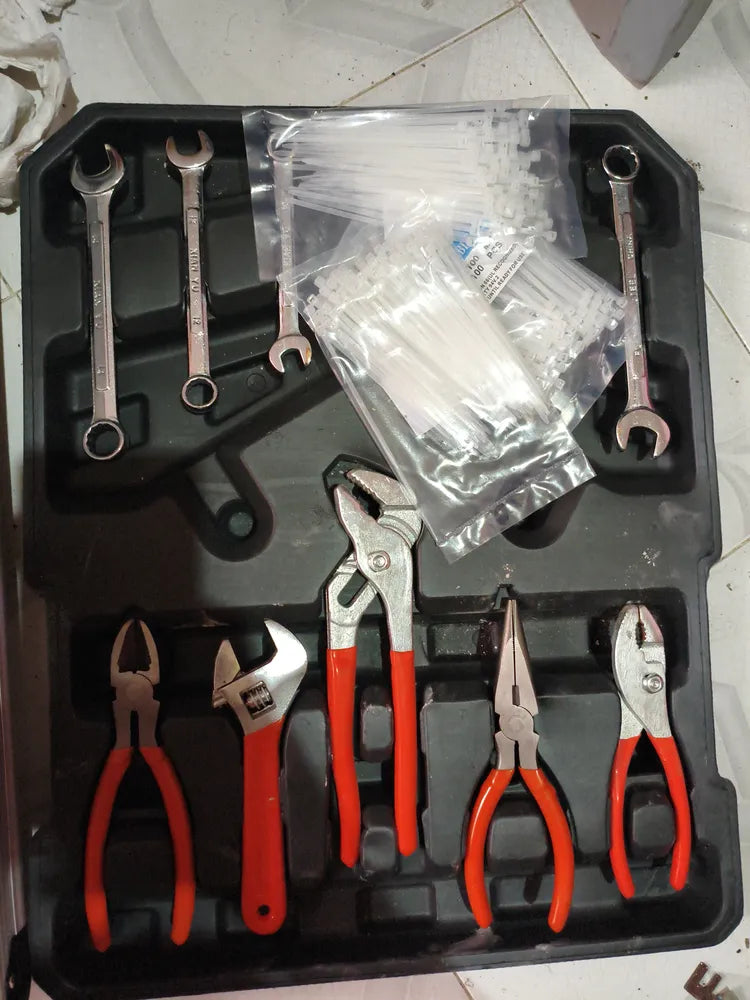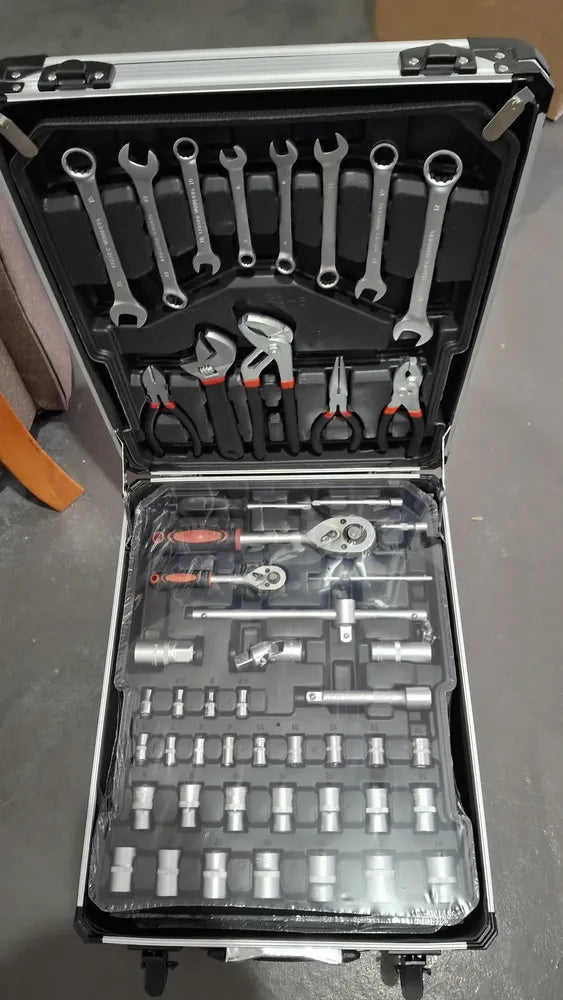 Juego De Herramientas De Taller Mecánico, 512 Piezas Herramientas esenciales de bricolaje: este juego de herramientas mecánicas incluye un martillo, llave, destornillador y otras herramientas domésticas comunes. Todas las herramientas se fijan en su lugar para un fácil almacenamiento y búsqueda. Kit de herramientas con ruedas: El kit de herramientas para el hogar adopta el estilo de diseño de equipaje de aluminio, y las herramientas se colocan en capas después de abrir, lo que es conveniente para encontrar. Se puede tirar de cualquier lugar a voluntad. Adecuado para profesionales y aficionados, haciendo el trabajo más fácil y eficiente. Material mejorado de alta calidad: el juego de herramientas para el hogar está diseñado con material, de alta resistencia, duradero, y el mango es antideslizante y cómodo, lo que protege tus manos y hace que tu trabajo sea más cómodo y relajante. Juego de herramientas básico familiar: este kit de herramientas de mano para el hogar casi incluye todo tipo de herramientas necesarias para el mantenimiento del hogar, incluyendo decoración del hogar, reparación de coches y herramientas de mantenimiento del hogar, que son muy prácticas. Satisface todas tus necesidades para proyectos de bricolaje. Este producto incluye : 1 pza Alicate de corte diagonal 150 mm 1 pza Llave ajustable 200 mm 1 pza Alicate tipo bomba (pico de loro) 230 mm 1 pza Alicate de punta larga 150 mm 1 pza Alicate de articulación deslizante 150 mm 8 pzas Llaves combinadas 8–17 mm 6 pzas Destornilladores de precisión 1.0, 1.4, 1.8, 2.4 mm, #0, #1 9 pzas Llaves Allen (hexagonales) 1.5–10 mm 24 pzas Puntas (bits) V3–V7, VPH.0–VPH.4, VPZ.1–VPZ.2, VT-10–VT-35, V.3–V.8 1 pza Mango para puntas 1 pza Portapuntas 11 pzas Destornilladores (-) 4×100 mm, 5×75 mm, 6×38 mm, 6×100 mm (+) 3×75 mm, 5×75 mm, 6×38 mm, 6×100 mm, 8×150 mm Aislados (+) 4×100 mm, (-) 4×100 mm 1 pza Recogedor magnético 1 pza Probador de voltaje 13 pzas Dados 1/4" 4–14 mm 14 pzas Dados 1/2" 8–21 mm 2 pzas Dados para bujías 1/2" 16 y 21 mm 2 pzas Juntas universales 1/2" y 1/4" 2 pzas Manijas en T deslizantes 1/2" y 1/4" 1 pza Barra de extensión 1/2" y 1/4" 2 pzas Llaves de carraca 1/2" y 1/4" 1 pza Mango giratorio 1/4" 150 mm 2 pzas Pinzas de nylon 90 mm 130 pzas Sujetadores 1 pza Martillo de uña 1 pza Tijeras 1 pza Pinza crimpadora 1 pza Cinta métrica 1 pza Cúter 1 pza Cinta aislante 1 pza Nivel 1 pza Maletín de aluminio Diseño de herramientas de cuatro niveles: Las herramientas para hombres están diseñadas con una caja de herramientas de cuatro niveles. Hay espaciadores especiales entre cada capa. Satisface tus necesidades diarias de bricolaje y mantenimiento profesional.