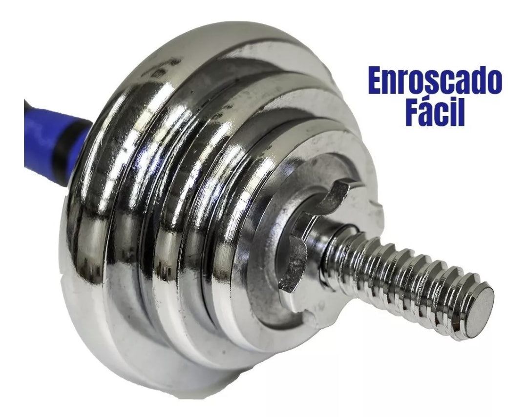 - Mancuernas, barra y discos de hierro cromado