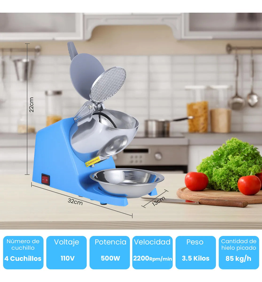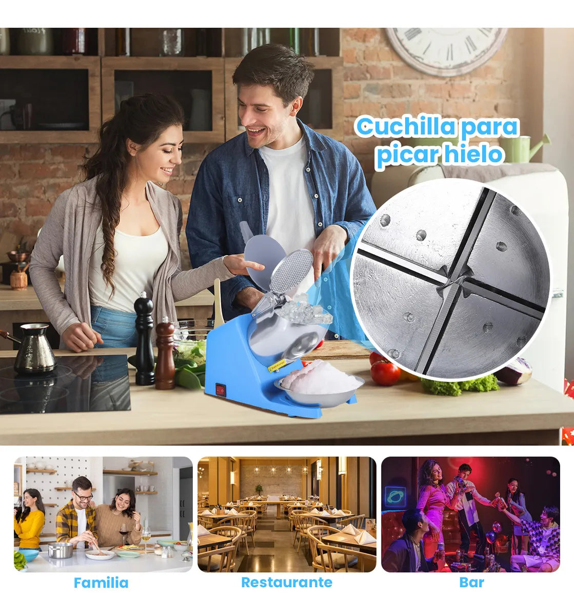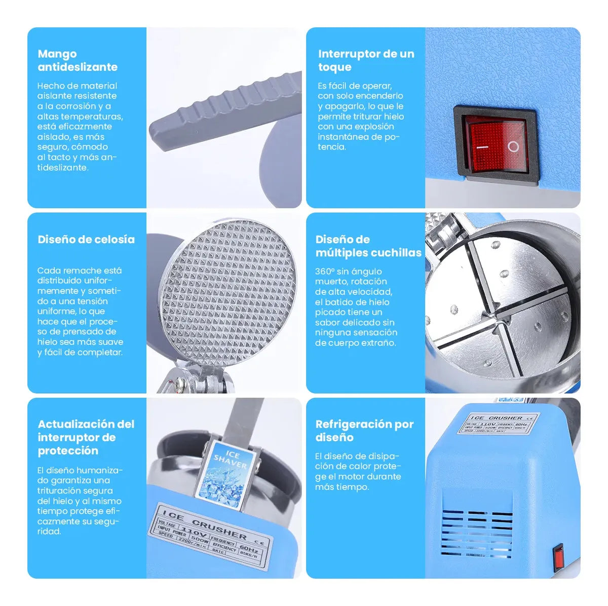 Característica: - Triturador de hielo de Cuatro pala con capacidad de trituración de hasta 85 Kg/hora. - El diseño interno del conducto de aire reductor de ruido en espiral reduce el ruido de baja frecuencia generado por el motor durante el funcionamiento, y más salidas de aire pueden disipar el calor y reducir el ruido. - Diseño de malla, cubitos de hielo a prueba de fugas y salpicaduras, acelera la velocidad de raspado de hielo. - Disipación de calor rápida, tiempo prolongado para romper el hielo, sistema de escape más bajo, disipación de calor más rápida, se puede romper más hielo. - La bandeja de hielo de diámetro ancho puede contener más hielo en polvo al mismo tiempo. --Acero Inoxidable Anticorrosión Apto Para Uso Alimentario-- el cuerpo principal y las cuchillas de la máquina para raspar hielo están hechos de acero inoxidable antioxidante apto para uso alimentario, lo que garantiza la higiene y la seguridad alimentaria. El diseño especial fácil de limpiar facilita la limpieza y la reutilización. También se incluye de forma gratuita un recipiente para hielo raspado de acero inoxidable apto para uso alimentario. Perfecto para el hogar, restaurantes, cafés, bares, cantinas, puestos de comida, festivales, ferias y más.