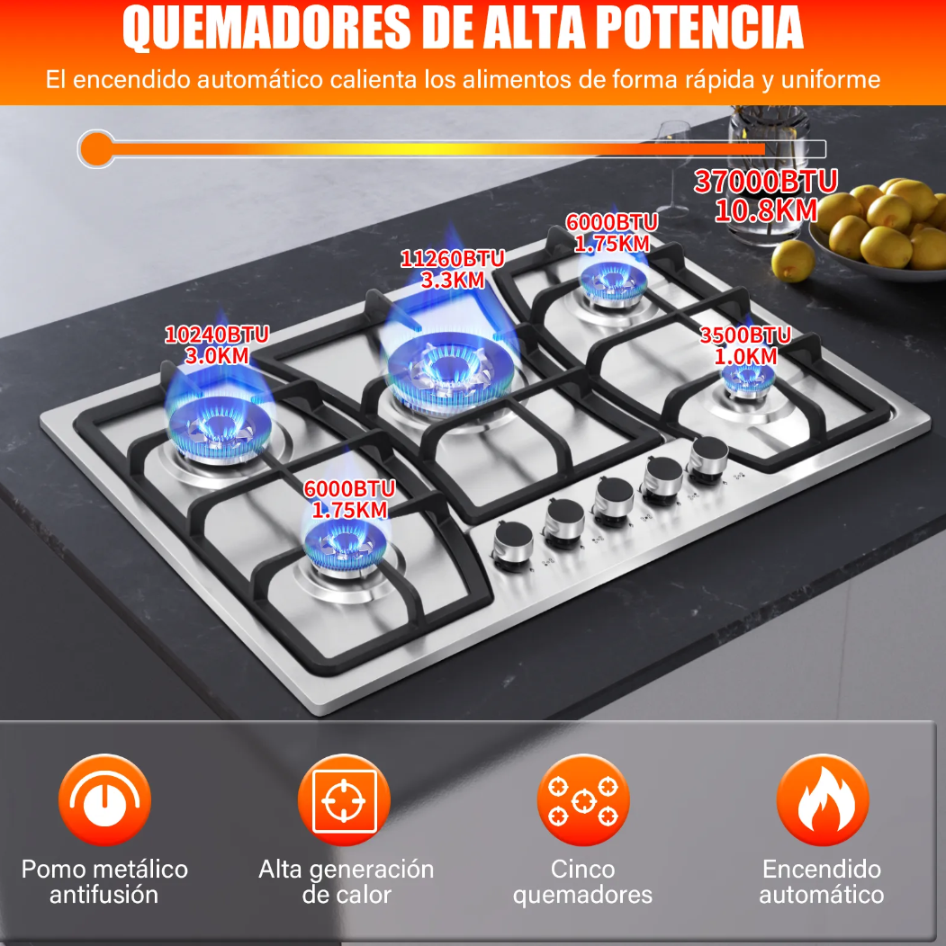 Esta placa de gas de 5 quemadores tiene 2 formas de instalación, colocada cómodamente sobre la encimera o empotrada, combinando perfectamente con la encimera de la cocina, ahorrando espacio y mejorando la belleza y el orden general de la cocina.