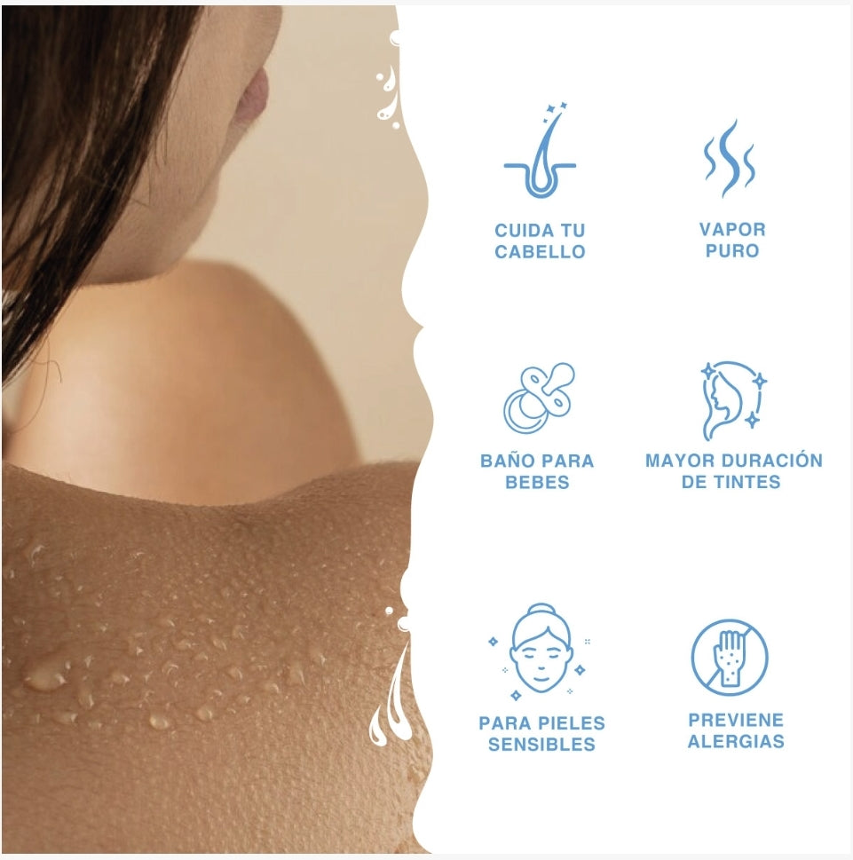 Usos: Cabello más saludable y sedoso. Piel suave e hidratada. Mejora la efectividad del shampoo, cremas y jabones. Prolonga tratamientos capilares. Cuerpo libre de cloro e impurezas, vapor puro. Apto para bebés. Agua de máxima calidad para proteger la piel, el cabello y todo el cuerpo. Ideal para pieles sensibles.