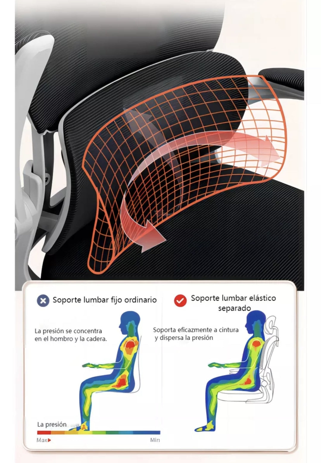 El respaldo en forma de arco biónico se combina con una malla de alta elasticidad, que se ajusta perfectamente a la curva de la espalda y brinda un fuerte soporte para la parte inferior de la espalda.