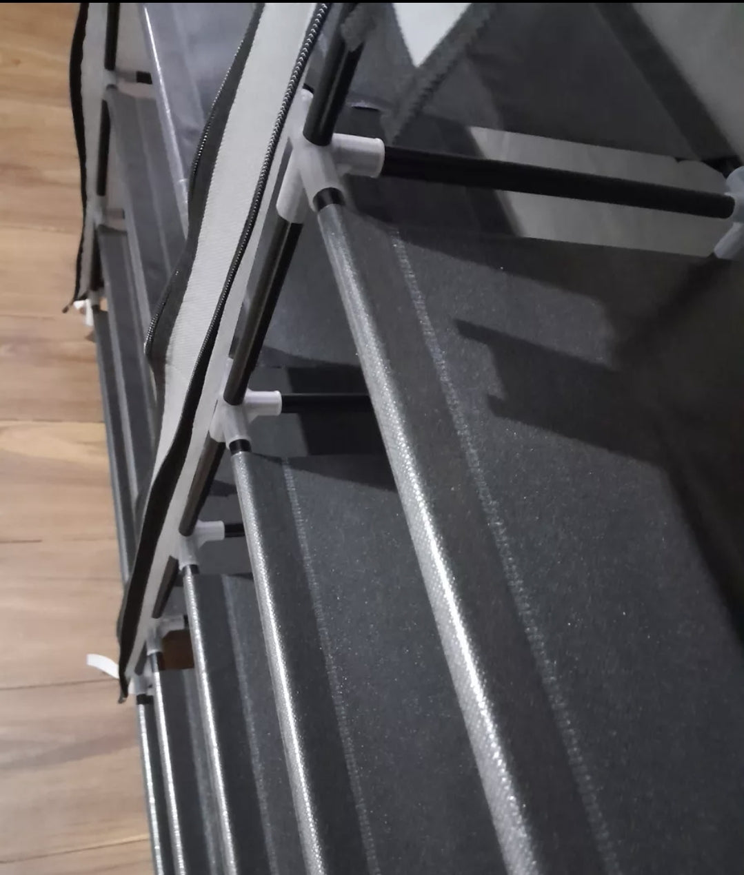 Se pueden almacenar hasta 6 pares por nivel, logrando un aproximado de 36 pares en total. Está fabricada con tubos de acero y conectores de plástico. Es ligera, por lo que reubicarla no es un problema.